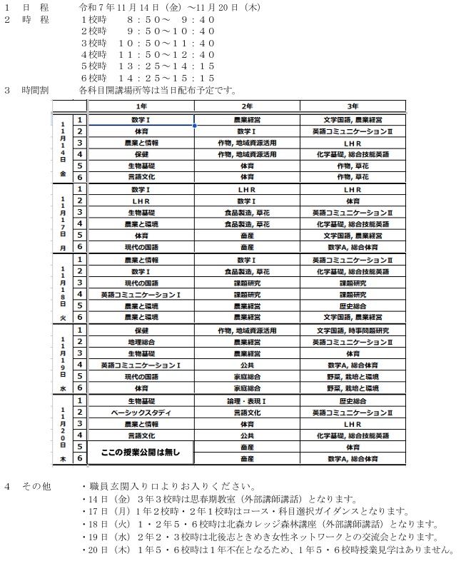 2025.11.07 授業公開週間のお知らせ。11/14(金)~11/20(木)まで授業公開を行います。下記に時間割を掲載します。職員玄関よりご来場ください。